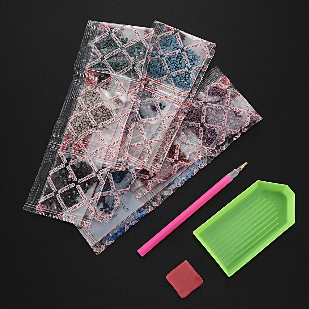 It includes Painting plate, pen, painting mud, diamond-cut color rhinestone beads, we offer extra more 15% beads for you to complete full drill painting.
