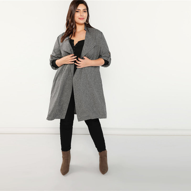 Grey Waterfall Collar Roll Tab Sleeve Office Wear Long Trench Coat 2018 Elegant Lady Outerwear