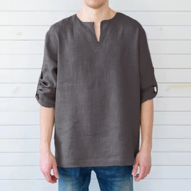 Men Long Sleeve Shirts Dress 100%Cotton V Neck Solid Loose Casual Shirts